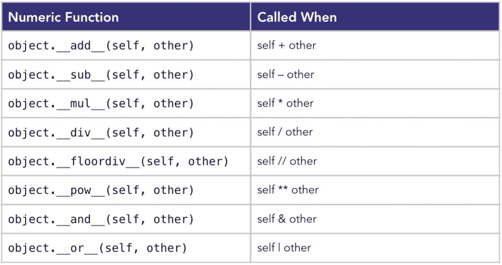 In many cases, it is convenient to perform mathematical operations on objects rather than numerical values. Python classes have the ability to emulate the behaviour of numeric values to support operations like addition and subtraction. You can override many more to support number-like functionality.