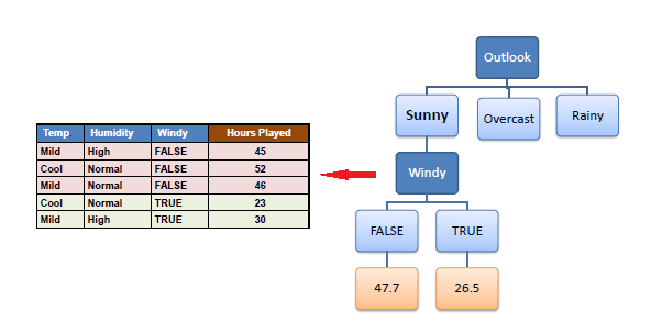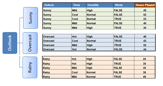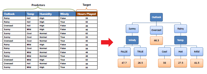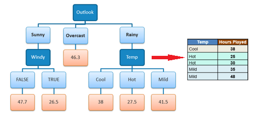 A decision node (e.g., Outlook) has two or more branches (e.g., Sunny, Overcast and Rainy), each representing values for the attribute tested. Leaf node (e.g., Hours Played) represents a decision on the numerical target. The topmost decision node in a tree which corresponds to the best predictor called root node. Decision trees can handle both categorical and numerical data.