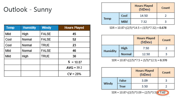 Step 4c: However, the “Sunny” branch has an CV (28%) more than the threshold (10%) which needs further splitting. We select “Windy” as the best best node after “Outlook” because it has the largest SDR.