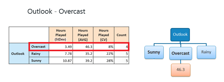 Step 4b: “Overcast” subset does not need any further splitting because its CV (8%) is less than the threshold (10%). The related leaf node gets the average of the “Overcast” subset.
